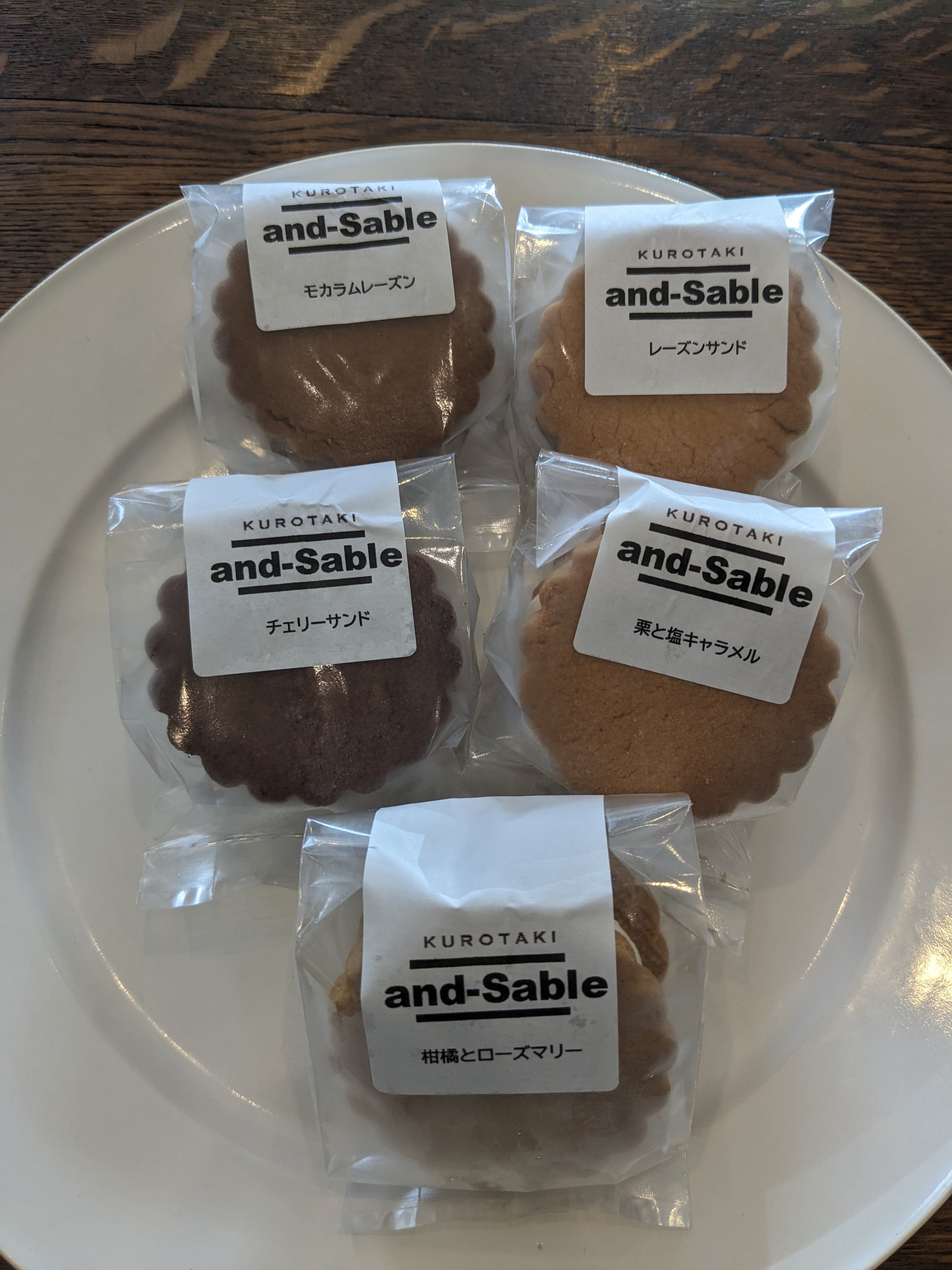 当店人気の厚焼きサブレを使用したバターサンドは、レーズン・栗と塩キャラメル・チェリー・モカラムレーズンと新作の『柑橘とローズマリー』の5種類のフレーバーをお楽しみいただけます。